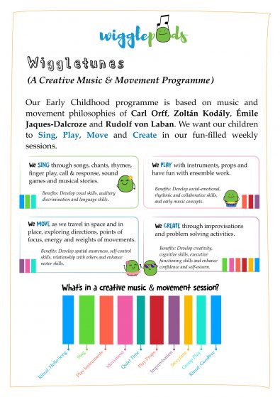 Wigglepods offers Wiggletunes – a premier creative music and movement programme for preschools. Developed by early childhood specialists and music educators, Wiggletunes is a holistic programme that aims to provide positive and creative music and movement experiences to stimulate and support children’s development. Through kinaesthetic activities involving singing, playing, moving and creating, the programme enhances the growth of children in terms of physical, language, cognitive, social and emotional development.